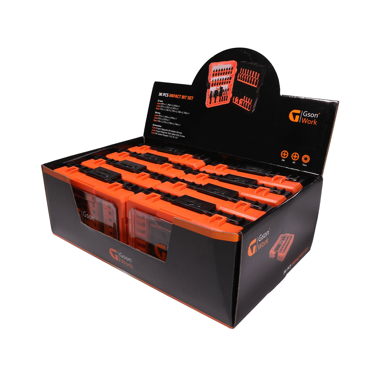 Produktinformation Produkt: Impact Bit Set 36 delar Antal i kartong: 8/16 st Impact Bit Set Innehåller PH, 25 mm: 1, 2, 2, 3 PZ, 25 mm: 1, 2, 2, 3 Torx, 25 mm: 15, 20, 20, 25, 25, 30, 30, 40 PH, 50 mm: 1, 2, 2, 3 PZ, 50 mm: 1, 2, 2, 3 Torx, 50 mm: 15, 20, 20, 25, 25, 30, 30, 40 Impact Magnetic Bit Holder: 60 mm Impact Magnetic Nut Setter: 8 & 13 mm Bit Socket Adapter: 1/4" & 1/2" -