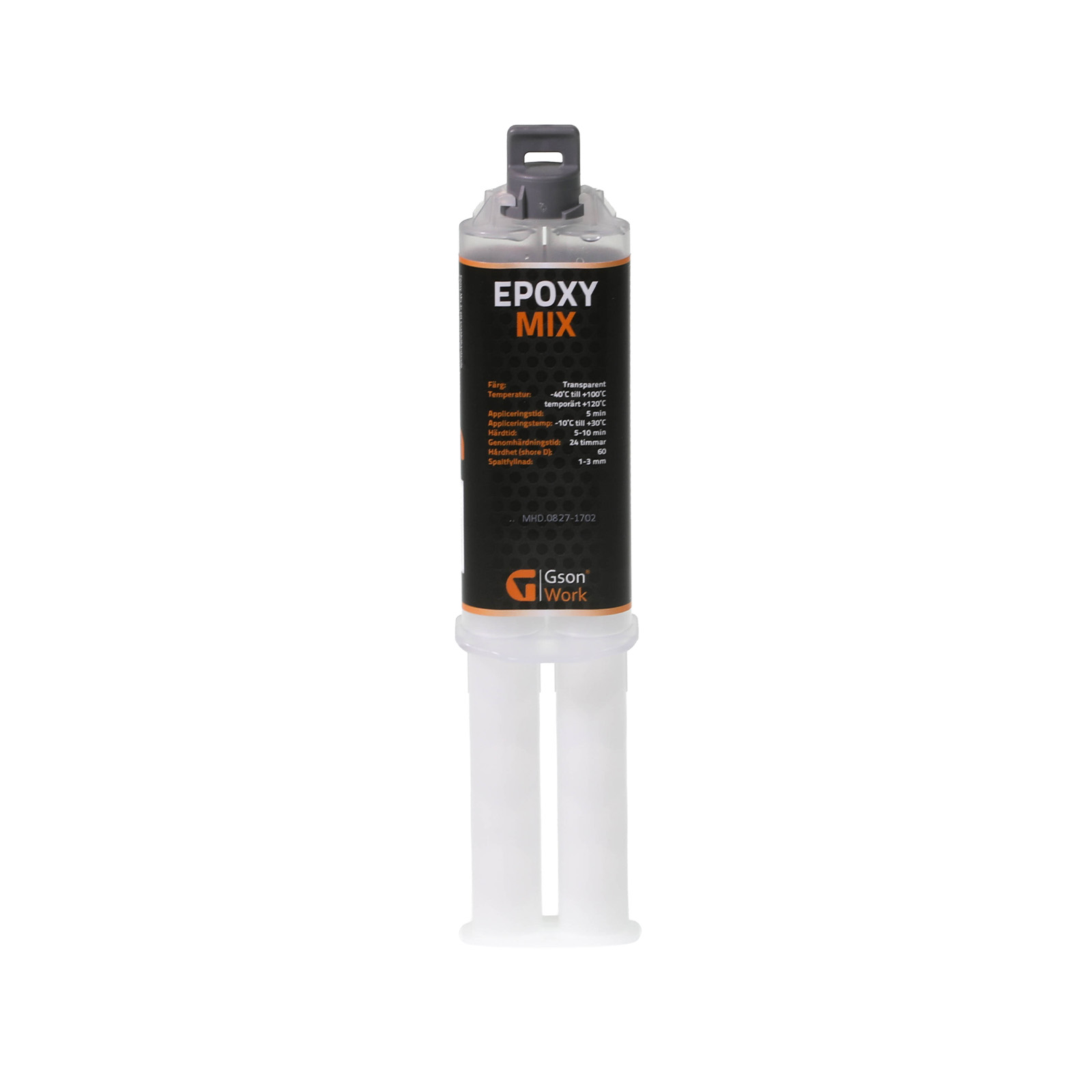 Produktinformation Produkt: Epoxy Mix, 25 g Antal i kartong: 14 st Information - 2-komponentslim Färg: Transparent Temperatur: -40°C till +100°C temporärt +120°C Appliceringstemperatur: +10°C till +30°C Appliceringstid: 5 min Härdtid: 5-10 min Genomhärdningstid: 24 timmar Hårdhet (Shore D): 60 Spaltfyllnad: 1-3 mm Draghållfasthet: > 10 N/mm2 - Information