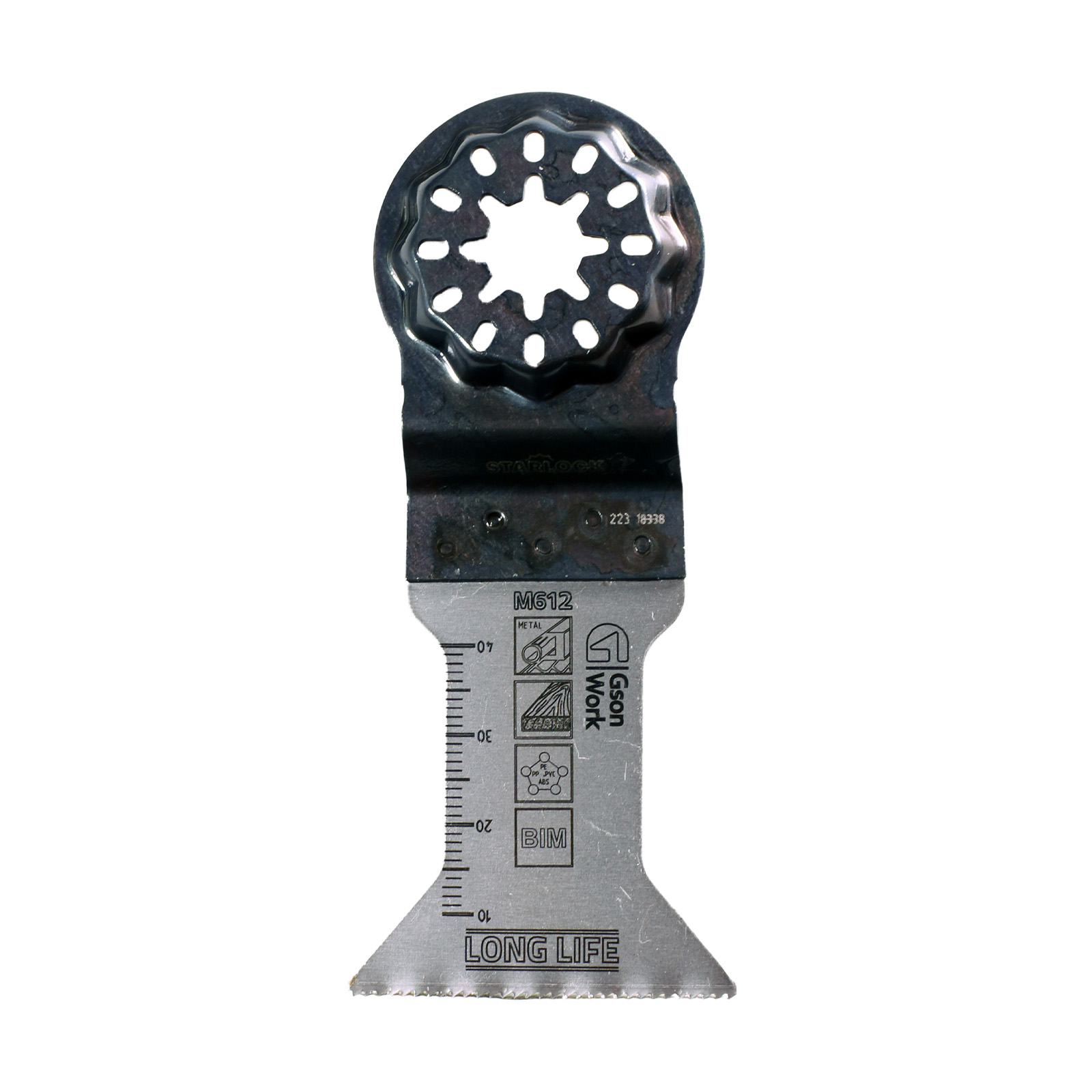Multisågblad i Bi-metall med vågig universaltandning. Brett användningsområde för plåt upp till 2 mm, aluminiumprofiler, kopparrör, trä, gipsskivor och plaster. Mellanbred insvängd form för optimal avverkningshastighet och bra spåntransport.